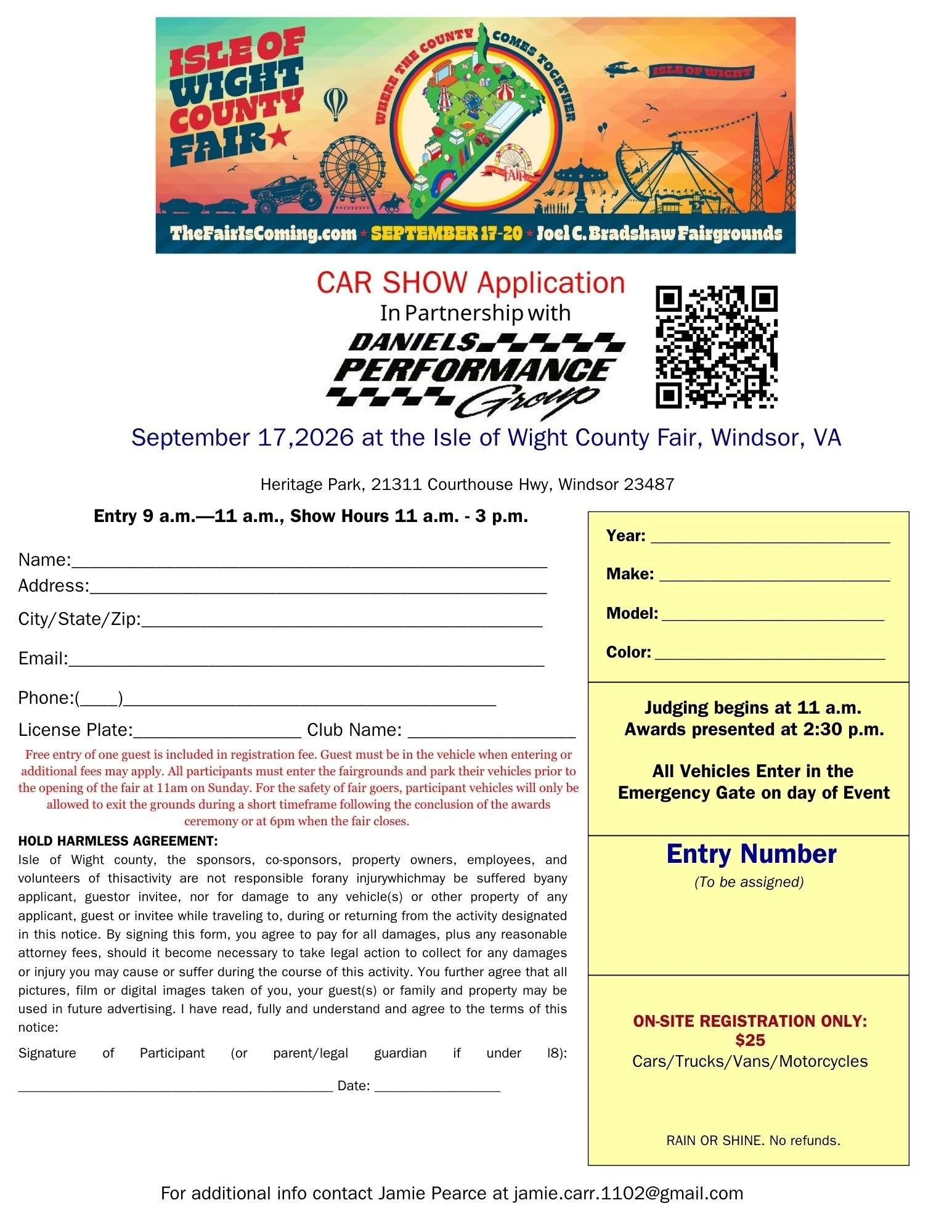 Custom Car Show Daniel's Performance Group Sunday, September 17 Check-In & Registration: 9 a.m. - 11 a.m.Show: 11 a.m. - 3 p.m.Awards: 3 p.m.contact Jamie Pearce <jamie.carr.1102@gmail.com> for more information.